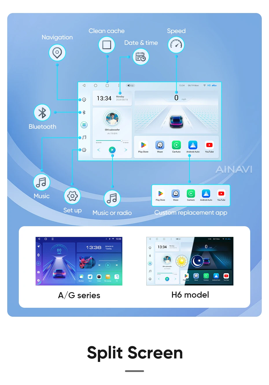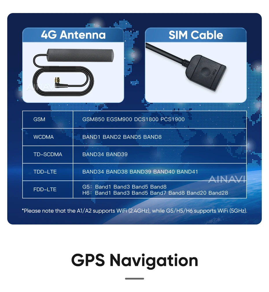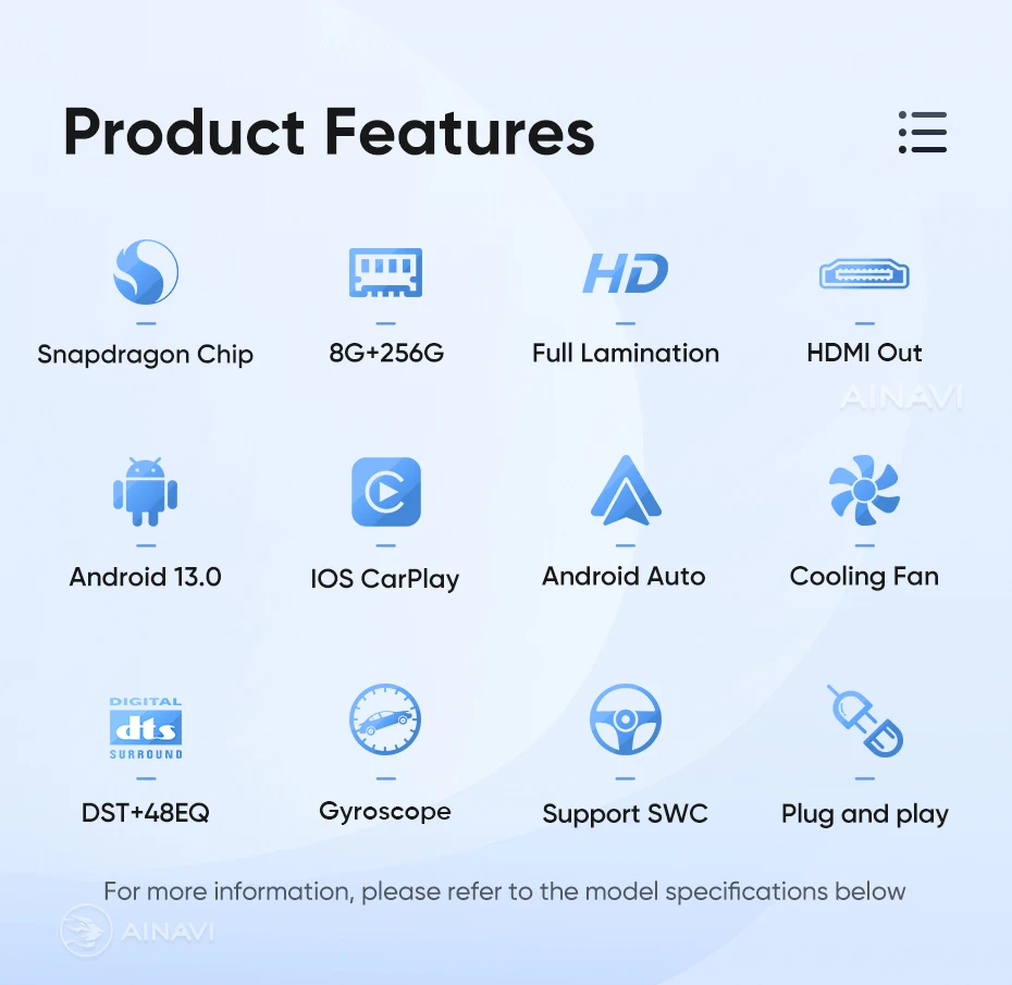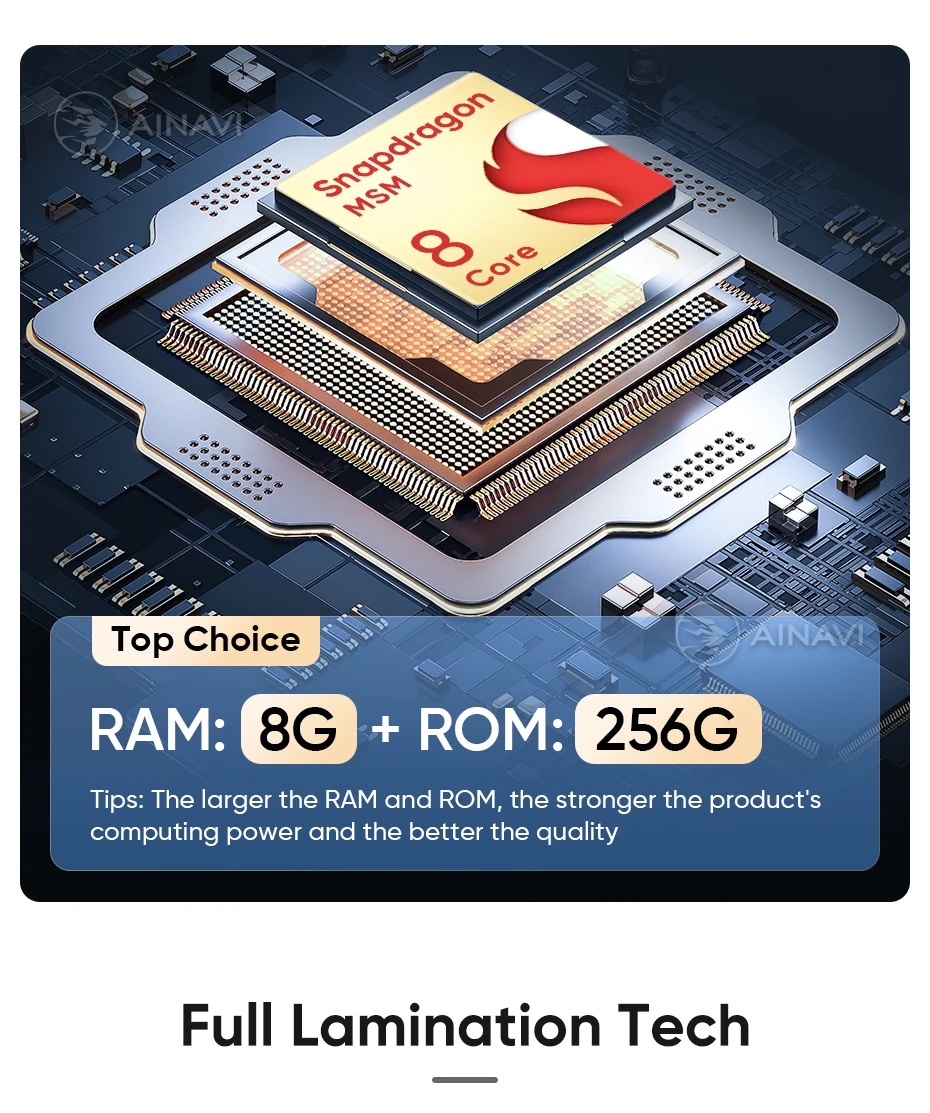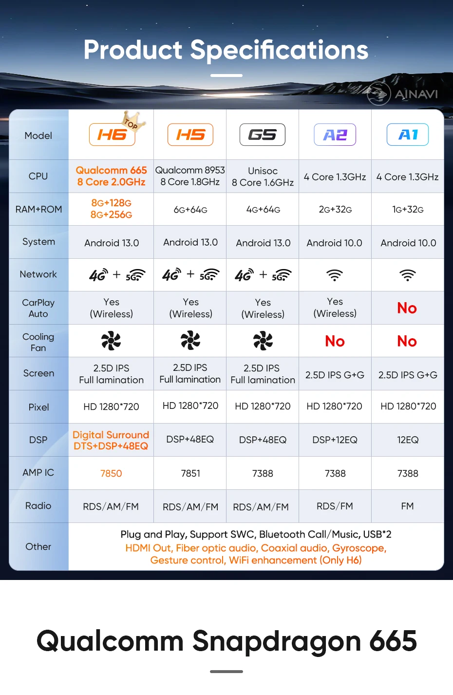 he H6 model is powered by a Qualcomm Snapdragon 665 octa-core processor built on a 11nm process for effcient performance. lt can handle multiple apps seamlessly.The screen is produced using the same full lamination technology as the mobile phone, which significantly improves the quality of the displayed image and color reproduction. Enjoy wireless CarPlay and Android Auto on the A2, G5 ,H5 and H6 models.Seamlessly connect your smartphone for hands-free control of calls, music, and navigation.H6 has built-in DTS tuning software, 48EQ makes the sound more delicate, and multiple DTS preset sound effect data make tuning easier. Virtual center sound effect/bass enhancement/sound feld control/focus adjustment, etc., make the journey more enjoyableExperience a new level of customization with Ainavi Ul 5.0.Its intuitive layout combined with editable shortcuts empowers you to create a user interface tailored to your preferences.Enjoy effortless navigation and effcient operation.Multitask effortlessly with split-screen functionality. Run two apps simultaneously on a single screen for enhanced effciency and productivity.G5 ,H5 and H6 support: Stay connected with built-in 4G LTE GSM, and WCDMA capabilities. For more convenience, a SlM card slot extension cable can be routed to the passenger storage area. Please note that 4G network compatibility varies by region and some regions may not support them.The H6 boasts advanced positioning with support for GPS Galileo, GLONASS, and BeiDou satellite systems. This multi-constelation technology delivers faster and more accurate location tracking for precise navigation and route guidance.