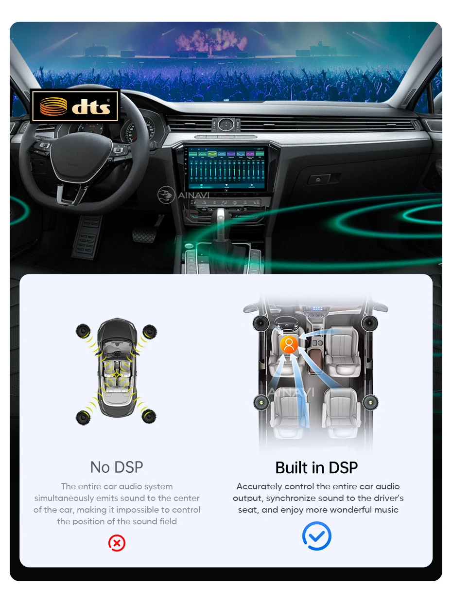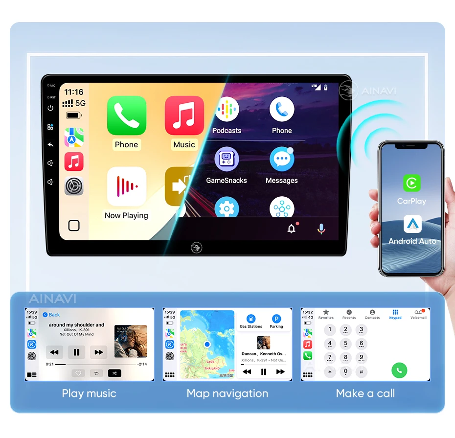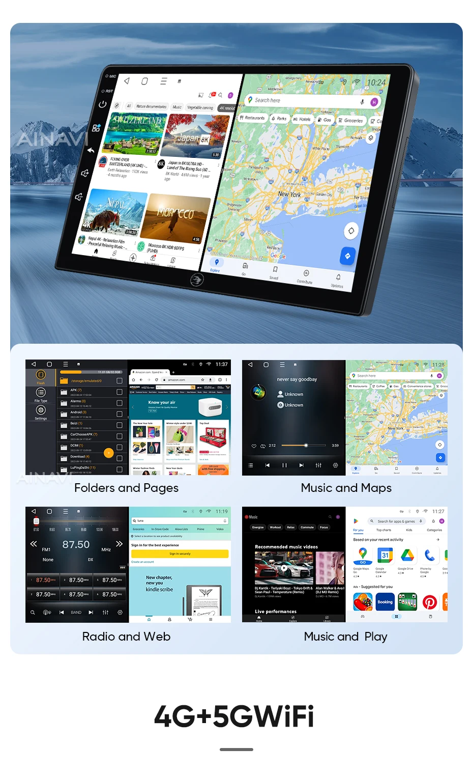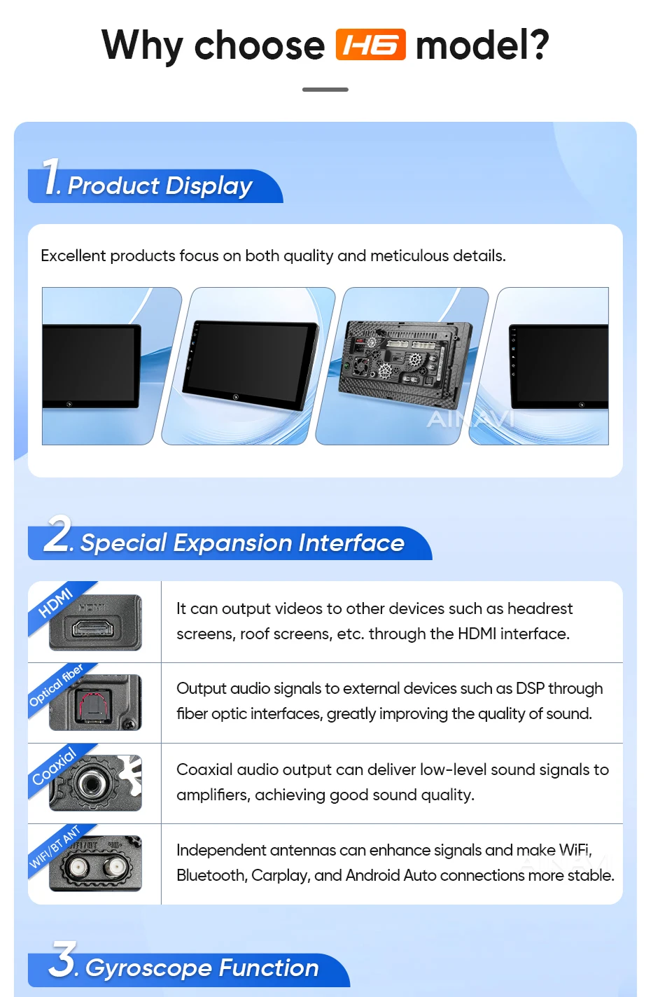 he H6 model is powered by a Qualcomm Snapdragon 665 octa-core processor built on a 11nm process for effcient performance. lt can handle multiple apps seamlessly.The screen is produced using the same full lamination technology as the mobile phone, which significantly improves the quality of the displayed image and color reproduction. Enjoy wireless CarPlay and Android Auto on the A2, G5 ,H5 and H6 models.Seamlessly connect your smartphone for hands-free control of calls, music, and navigation.H6 has built-in DTS tuning software, 48EQ makes the sound more delicate, and multiple DTS preset sound effect data make tuning easier. Virtual center sound effect/bass enhancement/sound feld control/focus adjustment, etc., make the journey more enjoyableExperience a new level of customization with Ainavi Ul 5.0.Its intuitive layout combined with editable shortcuts empowers you to create a user interface tailored to your preferences.Enjoy effortless navigation and effcient operation.Multitask effortlessly with split-screen functionality. Run two apps simultaneously on a single screen for enhanced effciency and productivity.G5 ,H5 and H6 support: Stay connected with built-in 4G LTE GSM, and WCDMA capabilities. For more convenience, a SlM card slot extension cable can be routed to the passenger storage area. Please note that 4G network compatibility varies by region and some regions may not support them.The H6 boasts advanced positioning with support for GPS Galileo, GLONASS, and BeiDou satellite systems. This multi-constelation technology delivers faster and more accurate location tracking for precise navigation and route guidance.