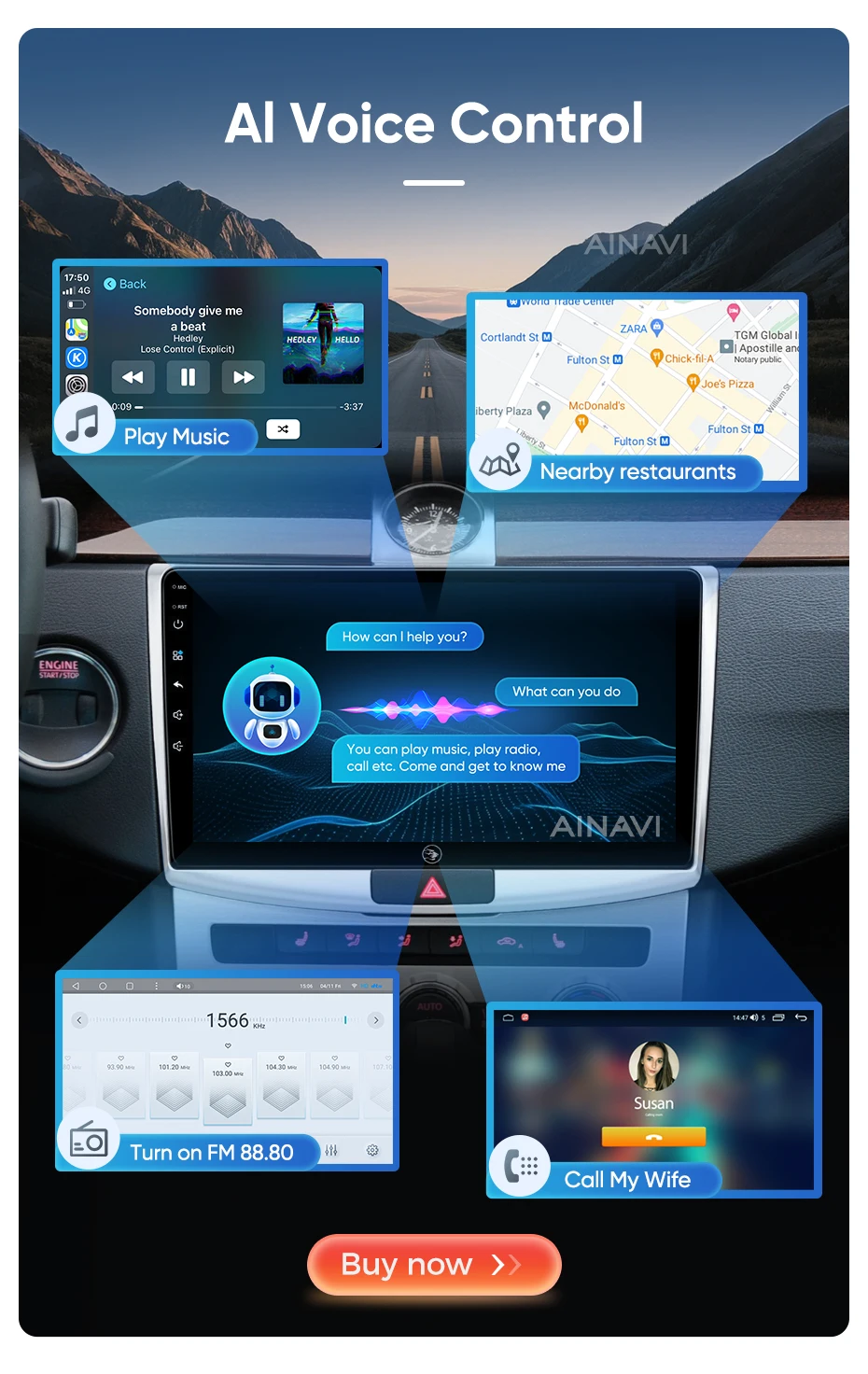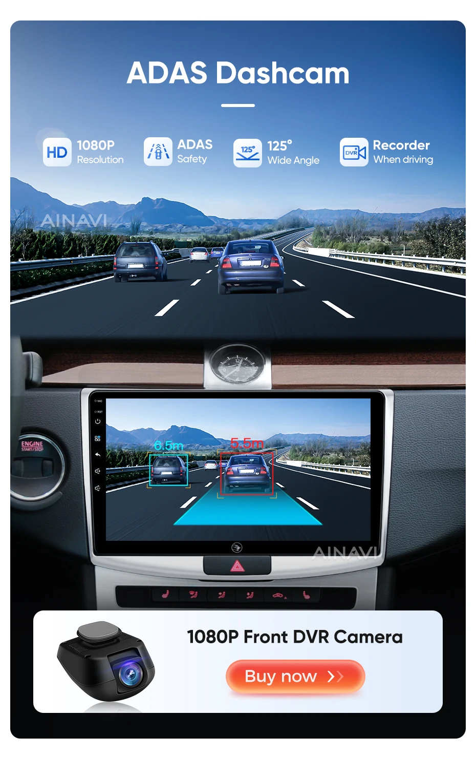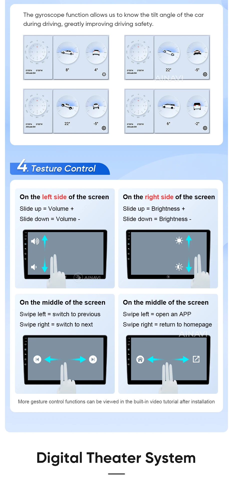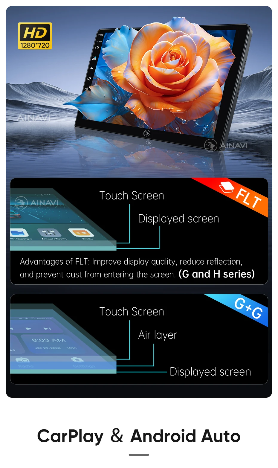 he H6 model is powered by a Qualcomm Snapdragon 665 octa-core processor built on a 11nm process for effcient performance. lt can handle multiple apps seamlessly.The screen is produced using the same full lamination technology as the mobile phone, which significantly improves the quality of the displayed image and color reproduction. Enjoy wireless CarPlay and Android Auto on the A2, G5 ,H5 and H6 models.Seamlessly connect your smartphone for hands-free control of calls, music, and navigation.H6 has built-in DTS tuning software, 48EQ makes the sound more delicate, and multiple DTS preset sound effect data make tuning easier. Virtual center sound effect/bass enhancement/sound feld control/focus adjustment, etc., make the journey more enjoyableExperience a new level of customization with Ainavi Ul 5.0.Its intuitive layout combined with editable shortcuts empowers you to create a user interface tailored to your preferences.Enjoy effortless navigation and effcient operation.Multitask effortlessly with split-screen functionality. Run two apps simultaneously on a single screen for enhanced effciency and productivity.G5 ,H5 and H6 support: Stay connected with built-in 4G LTE GSM, and WCDMA capabilities. For more convenience, a SlM card slot extension cable can be routed to the passenger storage area. Please note that 4G network compatibility varies by region and some regions may not support them.The H6 boasts advanced positioning with support for GPS Galileo, GLONASS, and BeiDou satellite systems. This multi-constelation technology delivers faster and more accurate location tracking for precise navigation and route guidance.