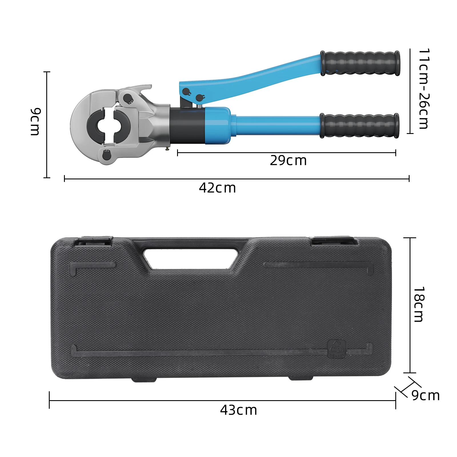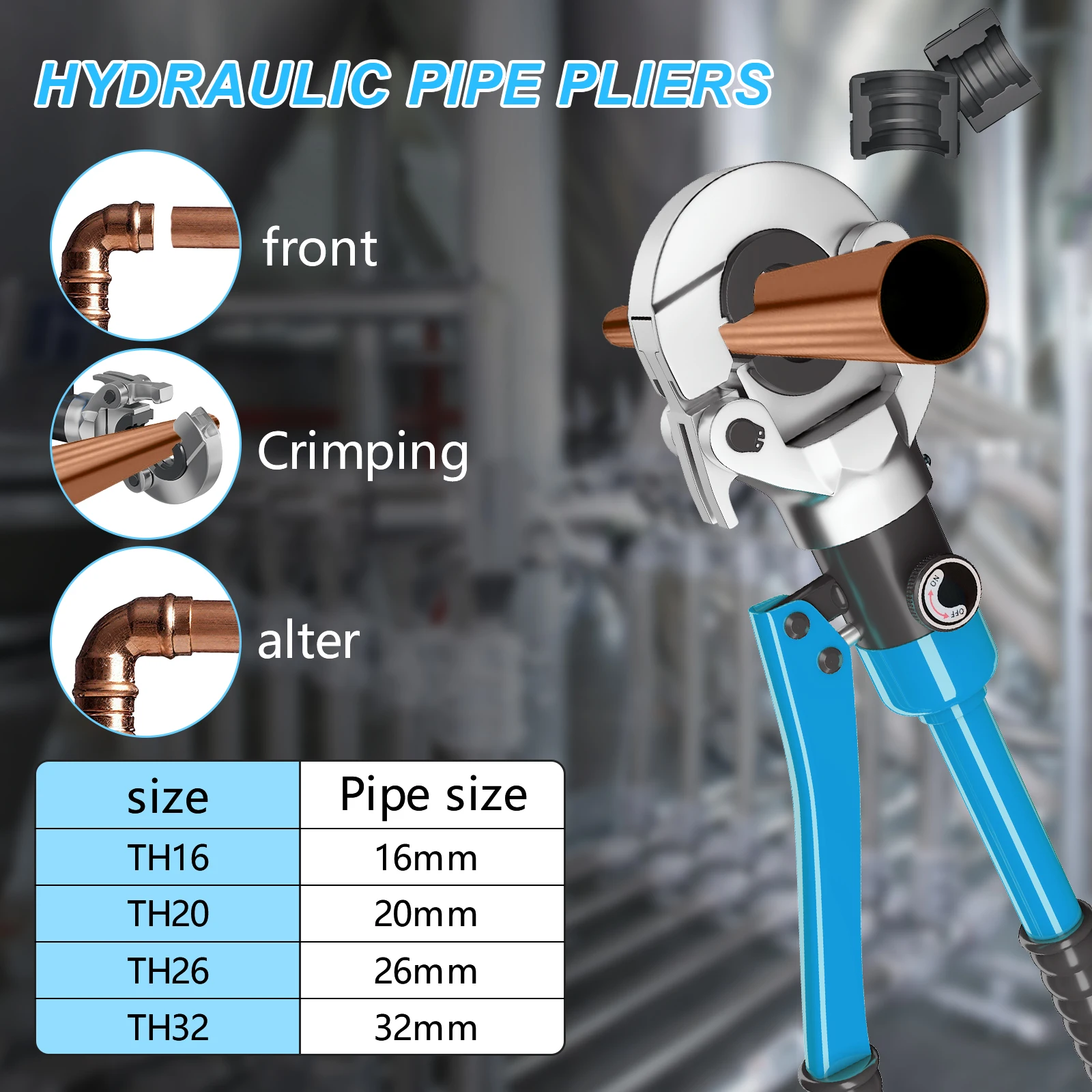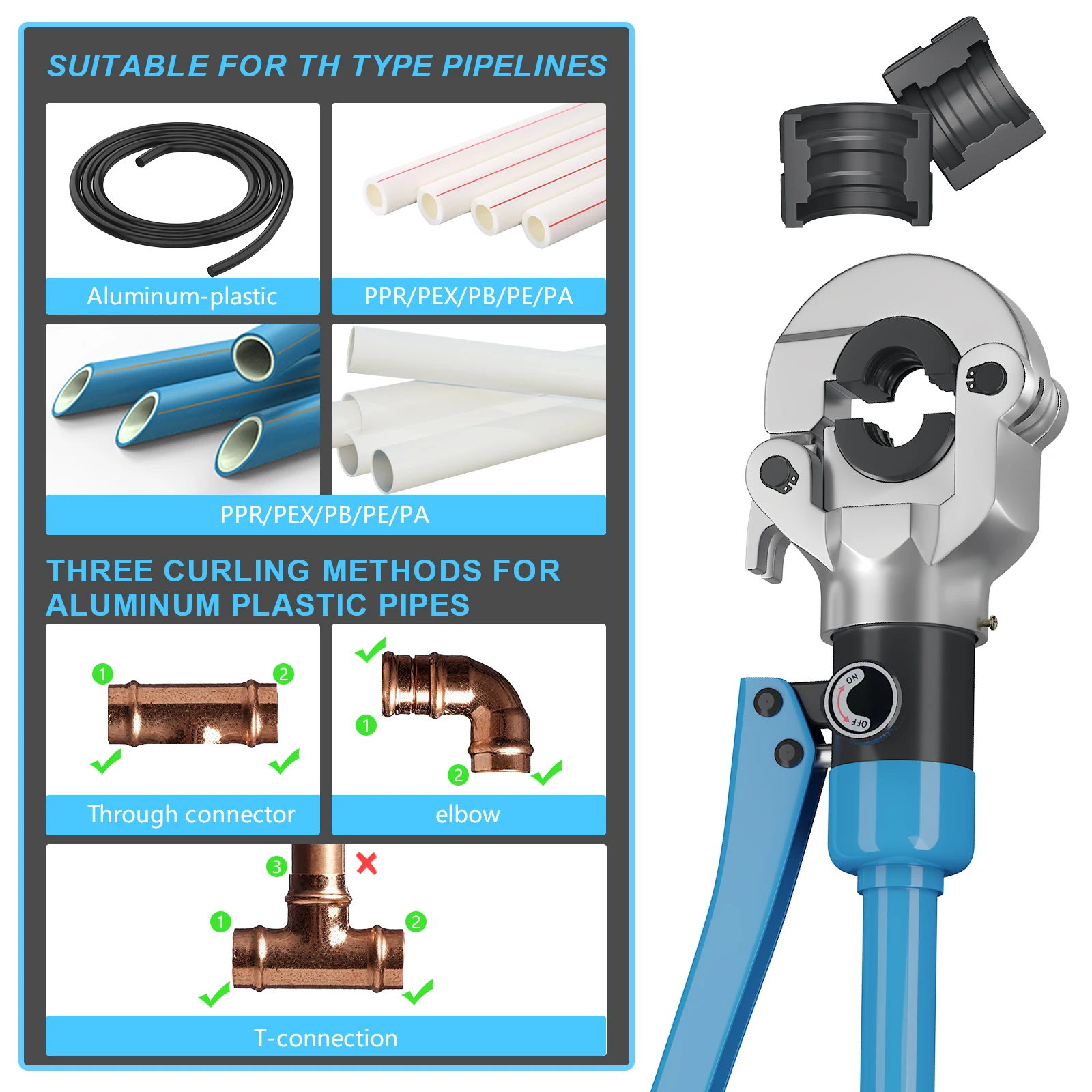 【Ampla faixa de aplicação】: O perfil TH da braçadeira de pressão é altamente adequado para várias instalações de tubos, incluindo aquecimento, água quente, água fria, água potável, aquecimento de piso e sistemas solares.Os tamanhos das alicates de prensa hidráulica são 16 mm, 20 mm, 26 mm e 32 mm, e são adequados para prensar tubos de alumínio-plástico e tubos de plástico PPR/PEX/PB/PE/PA.