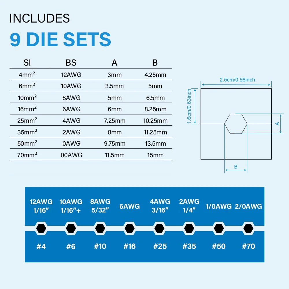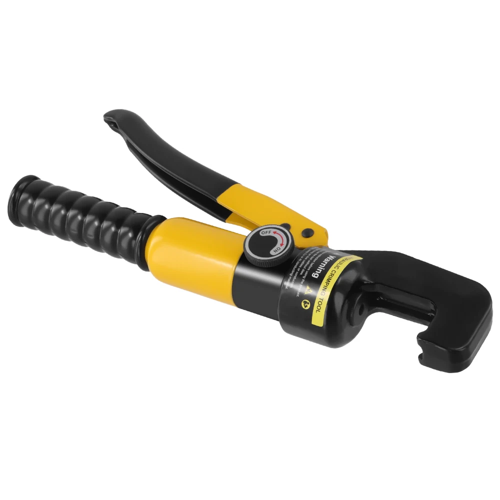 Funcionalidades:Ferramenta de Crimpagem Hidráulica -- Crimpagem de fios de cobre e alumínio de calibres 12 AWG a 2/0 AWG, força máxima de crimpagem: 10 toneladas.Curso de crimpagem: 12 mm.A cabeça do Crimper Hidráulico gira livremente em 360°, o que facilita o trabalho em espaços confinados e é ideal para baterias, cabos de solda, cabos de alimentação, fios, cabos de aço, guarda-corpos de cabos e muito mais.Matrizes de Crimpagem Cromadas -- Ferramenta de Crimpagem Hidráulica com matrizes de crimpagem para 12 AWG, 10 AWG, 6 AWG, 4 AWG, 2 AWG, 0 AWG e 2/0 AWG, e 1/8" para cabo de aço inoxidável, permitindo criar crimpagens hexagonais fortes para um visual limpo e eficiente no seu projeto.A crimpadora hidráulica de terminais é mais fácil, eficiente e exige menos mão de obra do que a crimpagem manual.MATERIAL RESISTENTE -- Ferramenta de Crimpagem Hidráulica de Fios, temperada e revenida em altas temperaturas para excelente tenacidade e sem risco de quebra.A ferramenta hidráulica de crimpagem manual é feita de aço endurecido de calibre 45 de alta qualidade com acabamento cromado.As alças são impregnadas de vinil para uso confortável, fácil controle e recursos antiderrapantes.FÁCIL DE USAR: Ao crimpar terminais de cabos de bateria, aço inoxidável, ferragens para guarda-corpos de arame, o controle liga/desliga permite uma operação rápida e fácil crimpagem e retração do braço.A cabeça em forma de C permite fácil acesso lateral para troca do molde.Esta ferramenta de crimpagem de cabo de bateria é adequada para entusiastas de bricolage, eletricistas, reparos automotivos e domésticos.Dicas de aquecimento - 1.Agite bem antes de ligar o produto, pois o líquido interno pode se depositar após um longo período de repouso ou transporte prolongado.2.Se a pressão falhar após o bombeamento, execute as etapas acima.Além disso, os crimpadores de cabos são verificados duas vezes antes de saírem da fábrica.Especificação:Material: metalConfiguração do formato: 4, 6, 10, 16, 25, 35, 50, 70 mm²Mais pressão: 10TMáx.Cubo: 12 mm/0,47 polegadasPrecauções:Direção de avanço do pistão se os trabalhadores não puderem ficar em pé para não estourar as partes feridas brilhantes do trabalho.A crimpagem dos grampos sem carga ou sem pressão sobre a peça de trabalho evita danos mecânicos à variante.Lista de embalagem:1 x alicate8 x pares de formas1x caixa de plástico